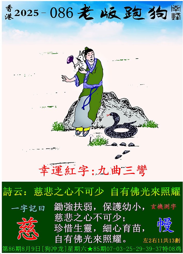 086期老版跑狗一字記之曰:【慈】 玄機測字:《幔》