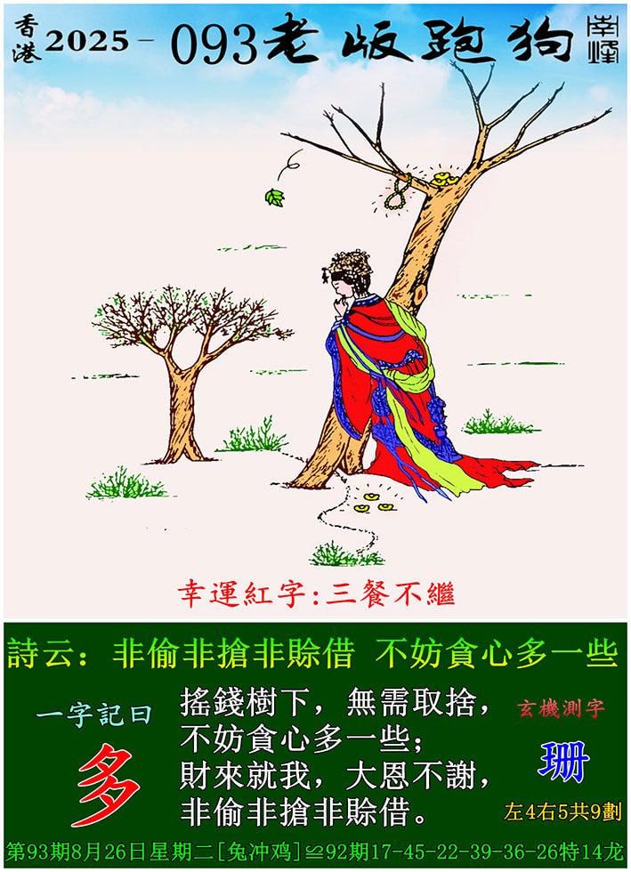 093期老版跑狗一字記之曰:【多】 玄機測字:《珊》