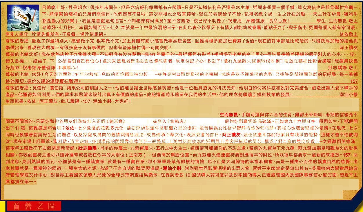 【1】.呂總晚上好,甚是想念。很多年未開信,但是六信報刊每期都有在閱讀。只是不知道信刊是否還是您主筆。近期來想買一個手鏈,這次寫信也是想您幫忙推薦一下,順便幫論壇裡的兄弟們問個肖,他們都等不及啦!這次問得也比較直接哈,就在於老總給予不給,記得老總?過一生之計在於勤,一天之計在於晨,雞狗牛都是勤力的好幫手,我甚是喜歡這句名言。不知老總有何高見?望不吝賜教!夜已深不叨擾了,祝老總:身體健康!長命百歲!  學生:生而無畏 敬上