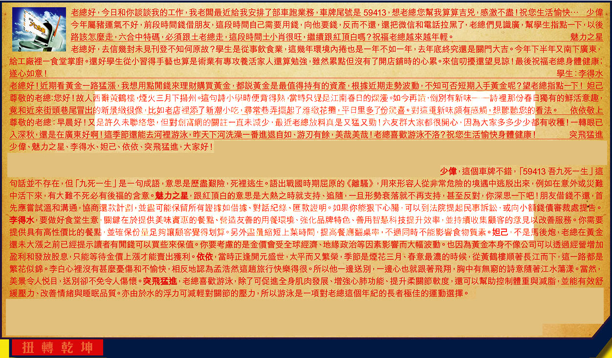 【1】.老總好,今日和你談談我的工作,我老闆最近給我安排了部車跑業務,車牌尾號是59413,想老總您幫我算算吉兕,感激不盡!祝您生活愉快... 少偉