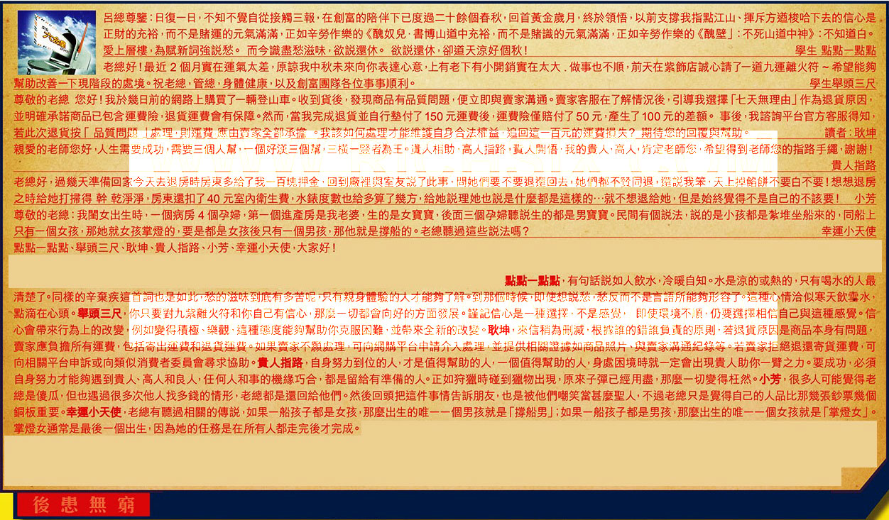 【2】,老總好!最近2個月實在運氣太差,原諒我中秋未來向你表達心意,上有老下有小開銷實在太大.做事也不順,前天在紫飾店誠心請了一道九運離火符~希望能夠幫助改善一下現階段的處境。祝老總,管總,身體健康,以及創富團隊各位事事順利。 學生舉頭三尺