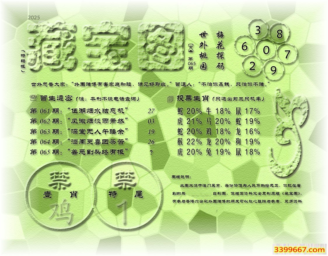 065期藏寶圖 新:障车儿郎且须缩 老:善恶到头终有报 禁:鸡 禁:1尾