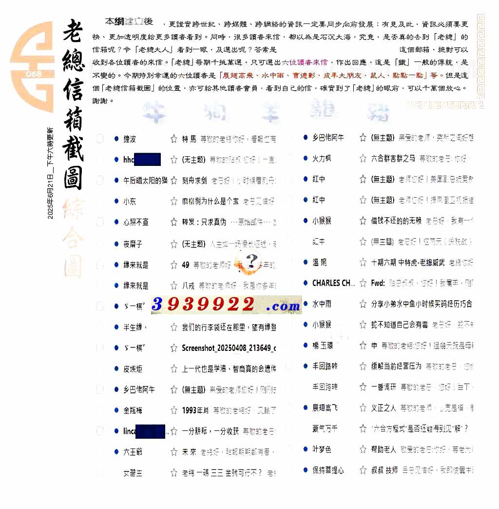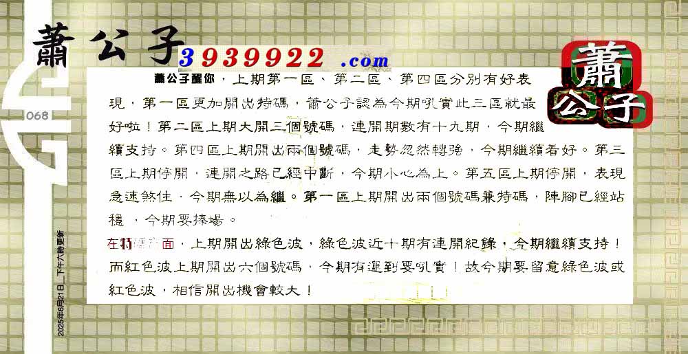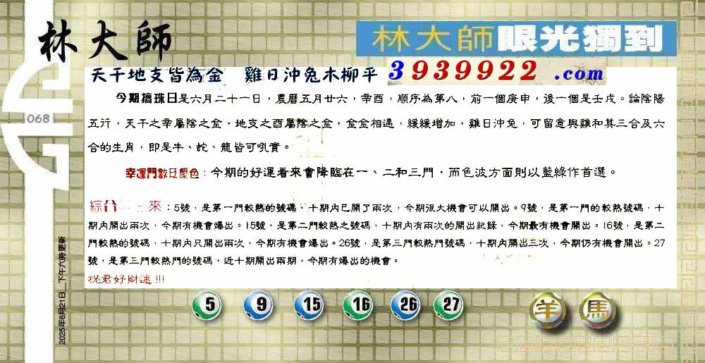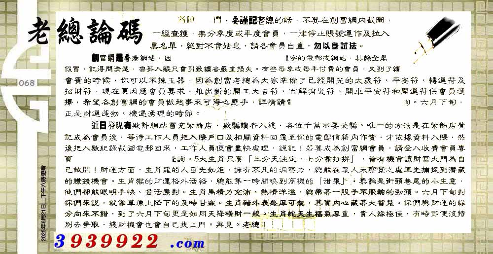 068期:六合皇金句/老总论码/萧公子/林大师/五行夺码/老总信箱截