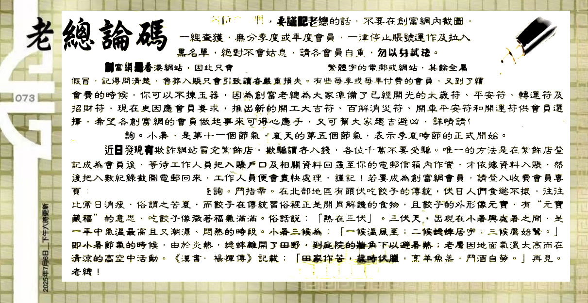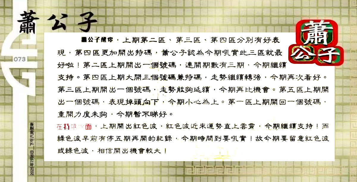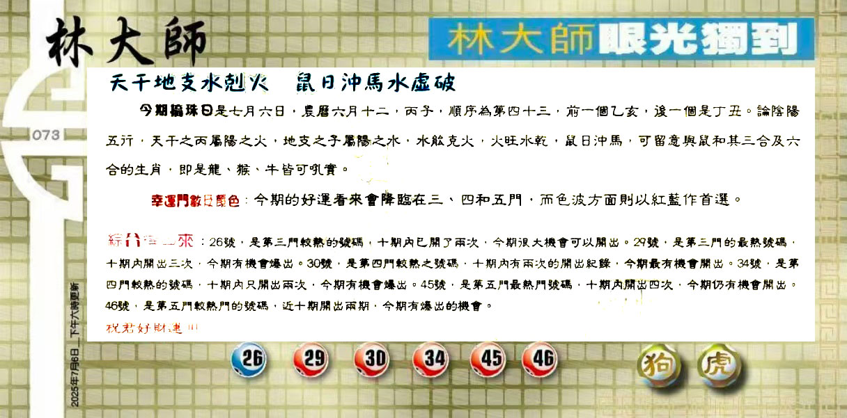 073期:六合皇金句/老总论码/萧公子/林大师/五行夺码/老总信箱截