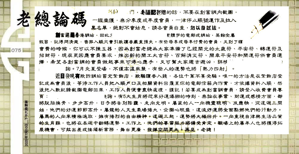 075期:六合皇金句/老总论码/萧公子/林大师/五行夺码/老总信箱截