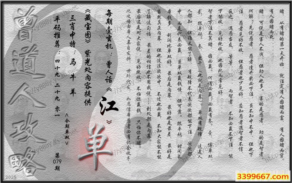079期藏寶圖 新:暗黄摇曳陆桥云 老:庭院沉沉白日斜 禁:鸡 禁:4尾 玄機字:《江》