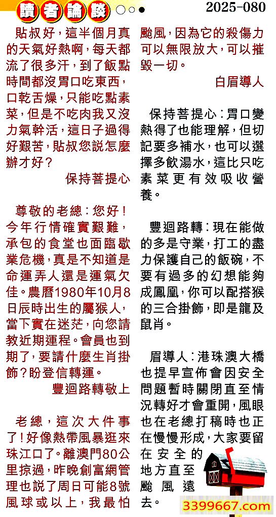 3.老總,這次大件事了!好像熱帶風暴逛來珠江口了。離澳門80公.里掠過,昨晚創富網管理也說了周日可能8號風球或以上,我最怕颱風,因為它的殺傷力可以無限放大,可以摧毁一切。====白眉導人