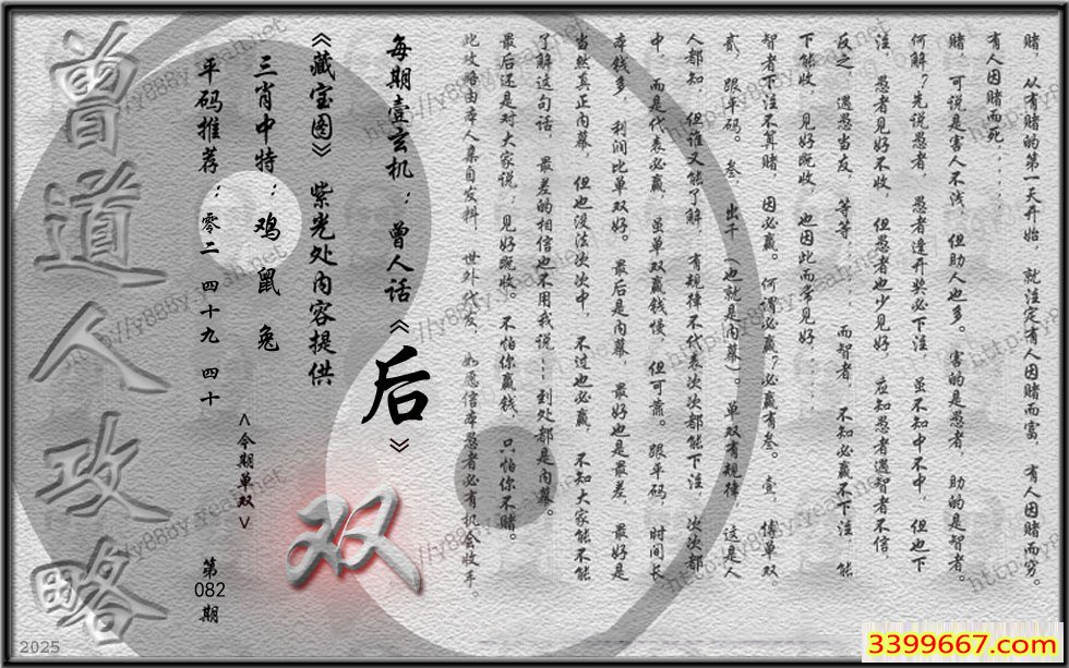082期藏寶圖 新:丽日疏烟破小春 老:几年冷落江南夜 禁:猪 禁:5尾 玄機字:《后》