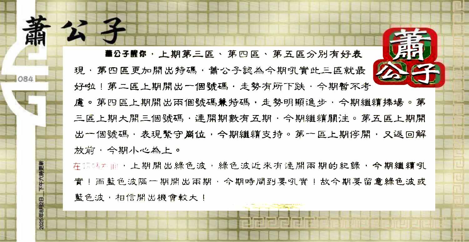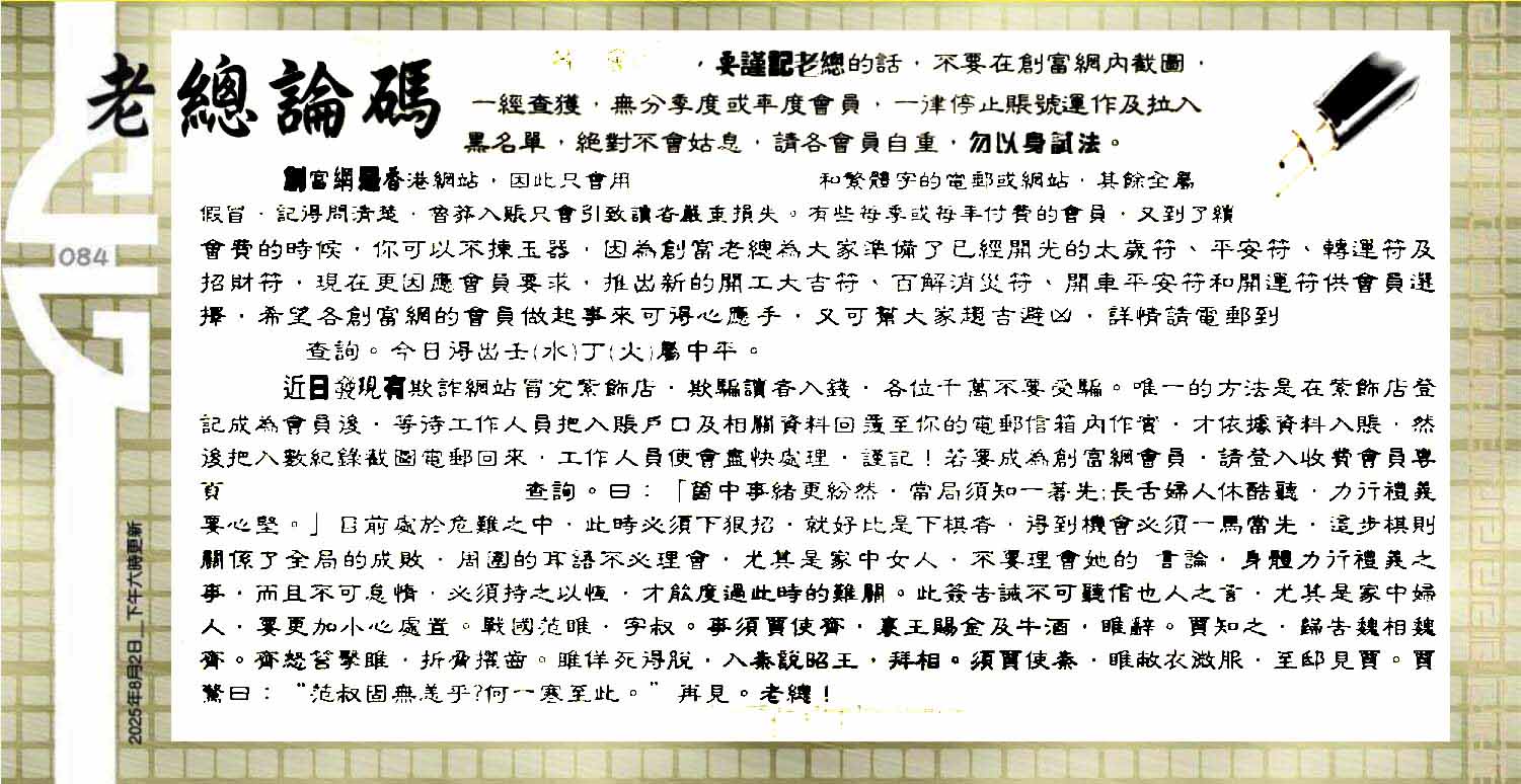 084期:六合皇金句/老总论码/萧公子/林大师/五行夺码/老总信箱截