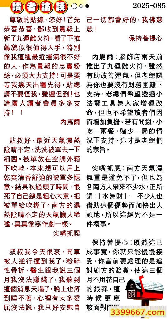 085期:彩民推荐〖貼信讀者論壇〗
