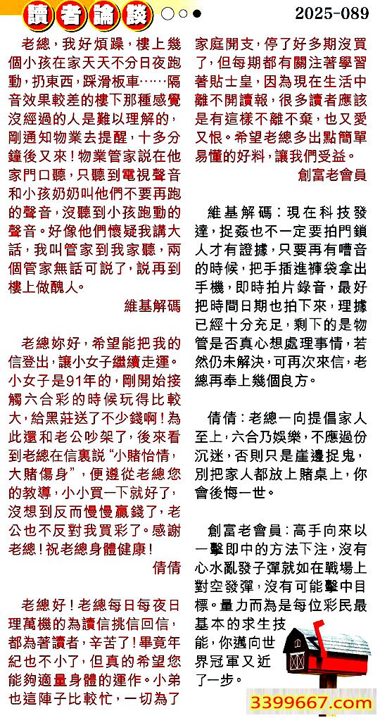 3.老總好!老總每日每夜日理萬機的為讀信挑信回信,都為著讀者,辛苦了!畢竟年紀也不小了,但真的希望您能夠適量身體的運作。小弟也這陣子比較忙,一切為了家庭開支,停了好多期沒買了,但每期都有關注著學習著貼士皇,因為現在生活中離不開讀報,很多讀者應該是有這樣不離不棄,也又愛又恨。希望老總多出點簡單易懂的好料,讓我們受益。====創富老會員