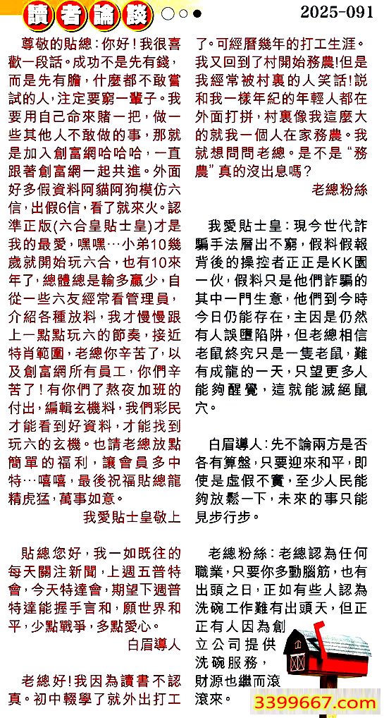 1.尊敬的貼總:你好!我很喜歡一段話。成功不是先有錢,而是先有脆,什麼都不敢當試的人,注定要窮一辈子。我要用自己命來賭一把,做一些其他人不敢做的事,那就是加入創富網哈哈哈,一直跟著創富網一起共進。外面好多假資料阿貓阿狗模仿六信,出假6信看了就來火。認準正版(六合皇貼士皇)才是我的最愛,嘿嘿,小弟10幾歲就開始玩六合,也有10來年了,總體總是輸多贏少,自從一些六友經常看管理員,介紹各種放料,我才慢慢跟上一點點玩六的節奏,接近特肖範圍,老總你辛苦了,以及創富網所有員工,你們辛苦了!有你們了熬夜加班的付出,編輯玄機料,我們彩民才能看到好資料,才能找到玩六的玄機。也請老總放點簡單的福利,讓會員多中特...嘻嘻,最後祝福貼總龍精虎猛,萬事如意。====我愛貼士皇敬上