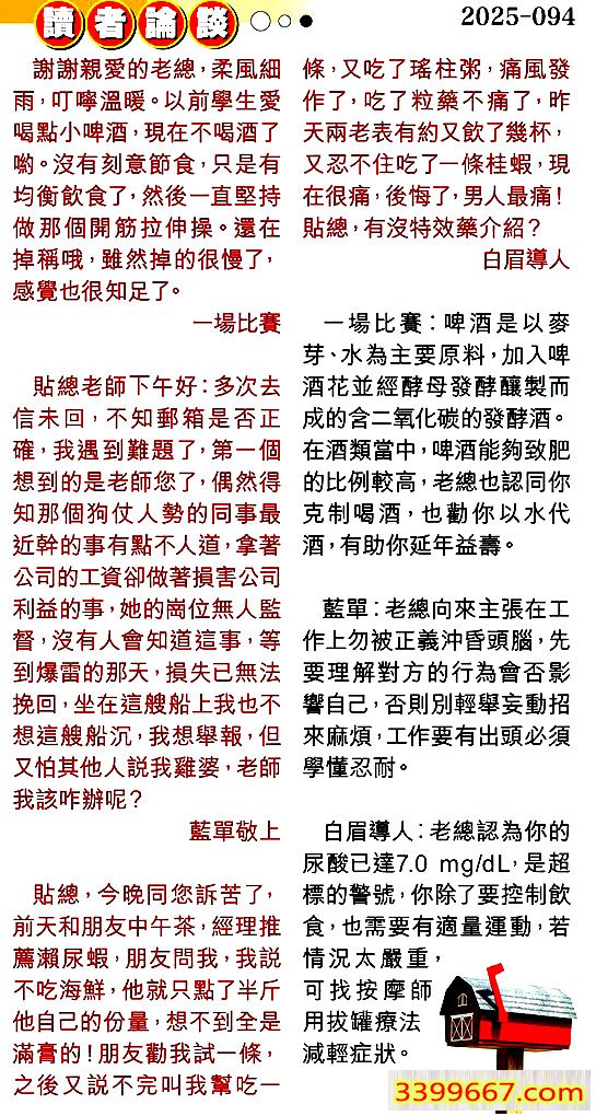 3.貼總,今晚同您訴苦了,前天和朋友中午茶,經理推薦瀨尿蝦,朋友問我,我說不吃海鮮,他就只點了半斤他自己的份量,想不到全是滿膏的!朋友勸我試一條,之後又說不完叫我幫吃一條,又吃了瑤柱粥,痛風發作了,吃了粒藥不痛了,昨天兩老表有約又飲了幾杯,又忍不住吃了一條桂蝦,現在很痛,後悔了,男人最痛!貼總,有沒特效藥介紹?====白眉導人