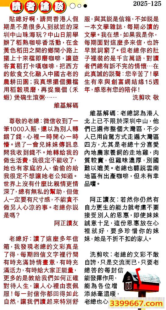 3.老總好:讀了這麼多年信箱,我發現老總的文彩真是了得,每期回信文字裡行間有時充滿詩情畫意,有時充滿活力,有時給大家正能量,更多的是教給我們如何正確對待人生,讓人心裡由衷佩服!每一封信你都回得如此自然,讓我們讀起來特別舒服,與其說是信箱,不如說是一本文學雜詵,每期必讀的文學。我在想,如果我是你,每期面對這麼多來信,也許早就詞窮了。但老總你的肚子裡装的是千言萬語,對讀者們總有訴不完的情懷...在此真誠的說聲:您辛苦了!學生有幸與創富網結緣15週年,感恩有您的陪伴!====洗剪吹敬