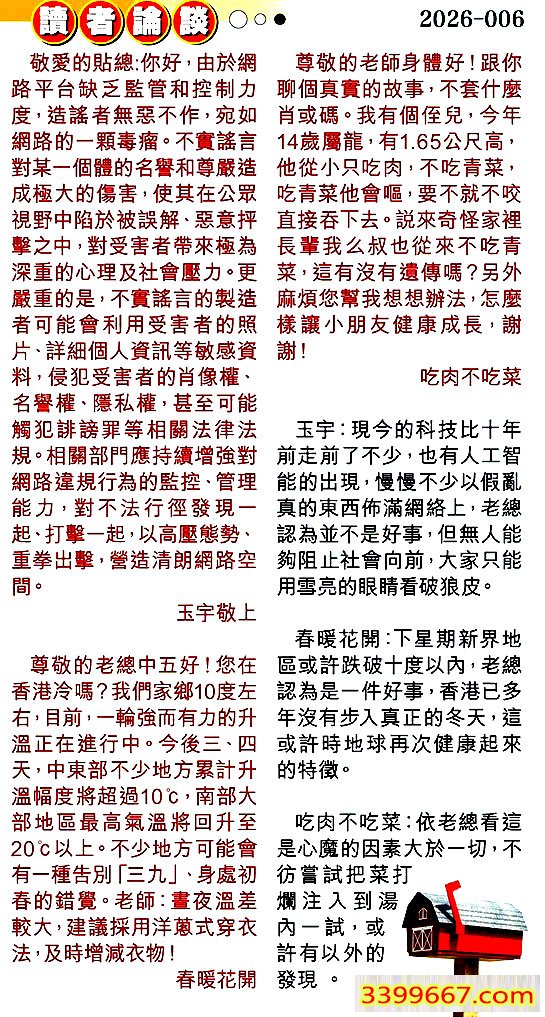006期:彩民推荐〖貼信讀者論壇〗